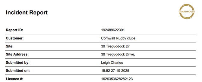 When creating a form template as standard on an incident report, it will generate with a Report ID (which the system will generate by default), Customer, Site, Site Address, Submitted By, Submitted On Date/ Time, and the License Number of the person submitting the form.