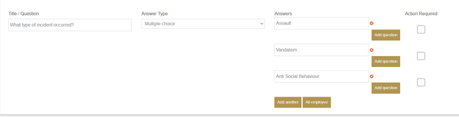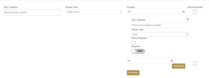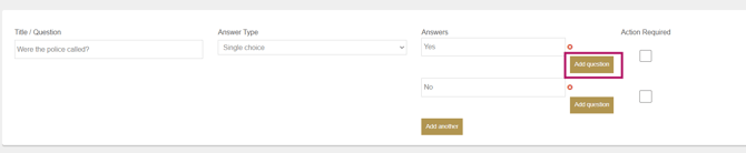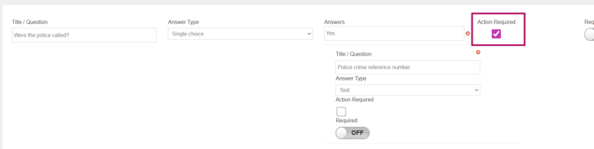 The option Action Required provides a warning triangle to admins on the dashboard when a certain answer is selected. For example, with this question, the selection of 'Yes' will trigger the warning: