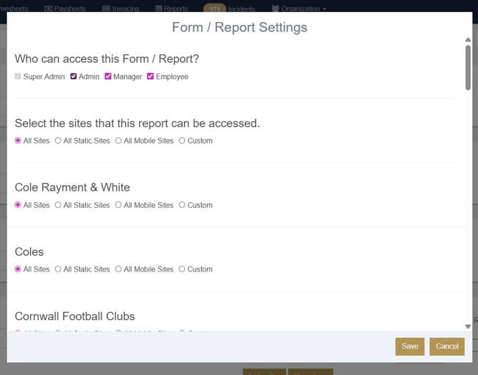 You can select which access permissions can access this form and which sites the form is available to be completed at: