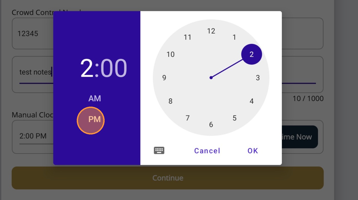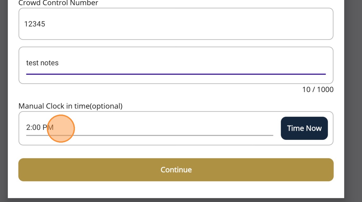 19. Custom ID (ex: Crowd Control Number), Notes, and Time options will be available depending on the set up done for the account.