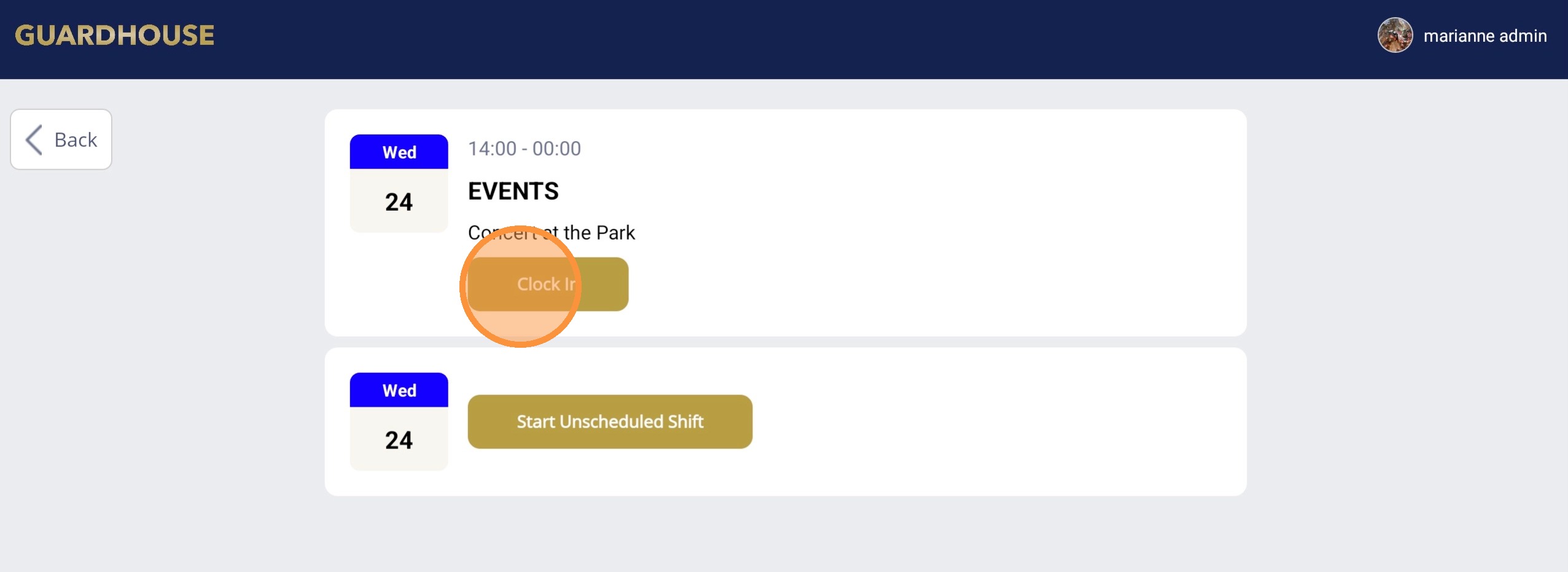 17. Once logged in, the guard will see their shift as well as the option to do an Unscheduled shift.