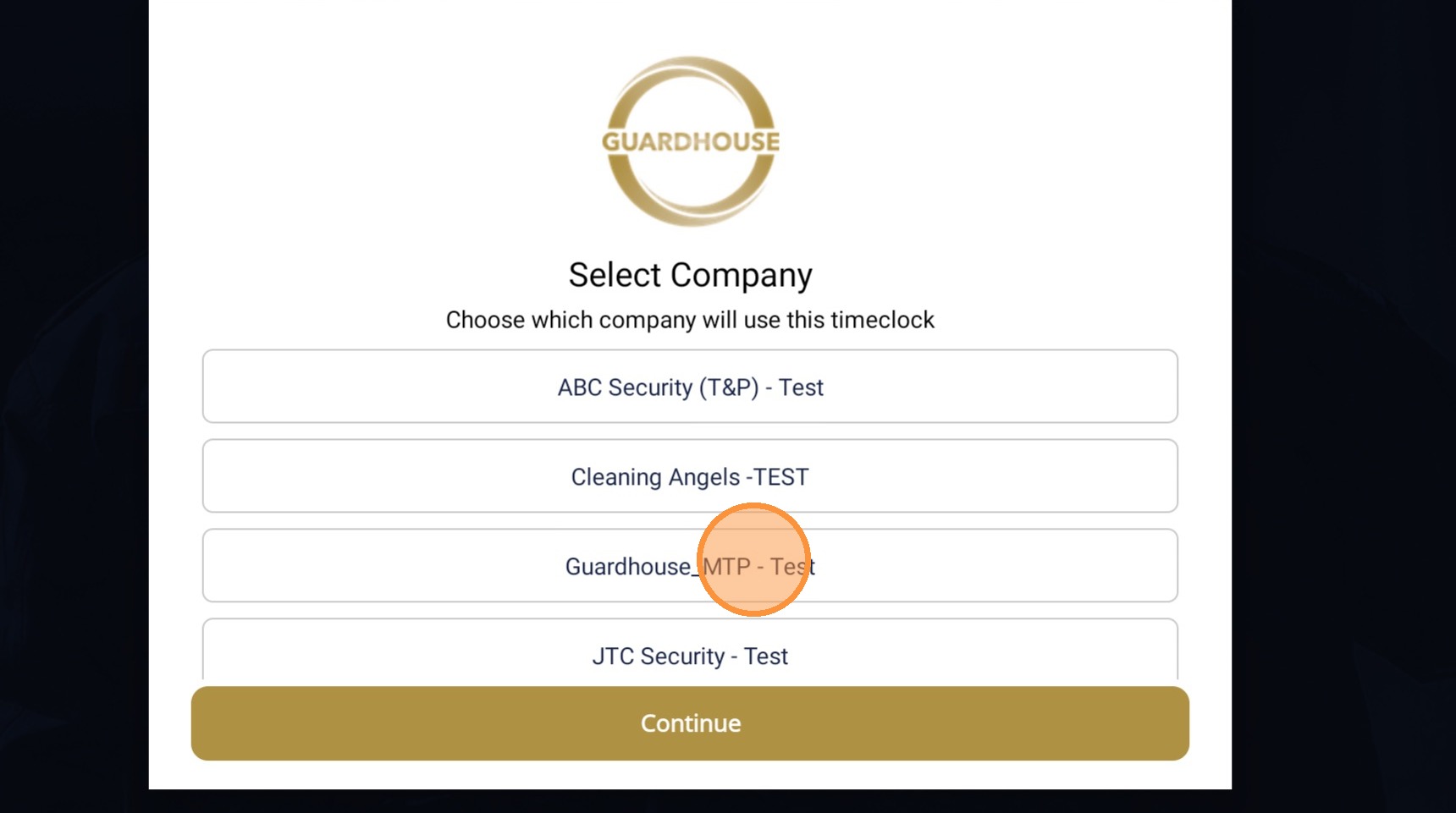 7. Switch company is now available for GH Timeclock. Choose the Guardhouse account you would like to set up the tablet clock in login for.