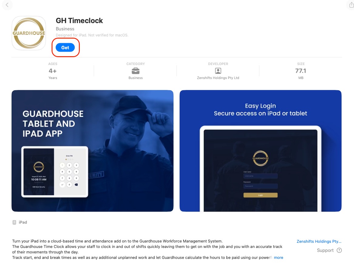GuardTime has been updated to GH Timeclock to provide additional features. Currently, this is avilable on the AppStore. For Android, this is to follow.