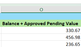 Column O shows the Balance + Approved Pending Value for a total value of estimated leave to be paid: