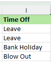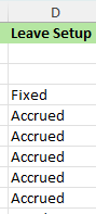 Column D shows the leave setup the staff member is on Fixed or Accrued will show in the box, if they are on Rolled Up leave, the box will be blank: