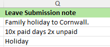 Column Q shows the Leave Submission Note, which is any notes that have been left by the employee when submitting the leave request:
