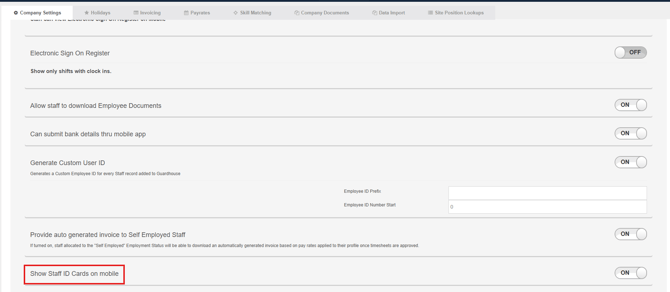 In order to setup staff ID cards, navigate to Organisation - Company - Company Settings - General - Show Staff ID Cards on mobile:
