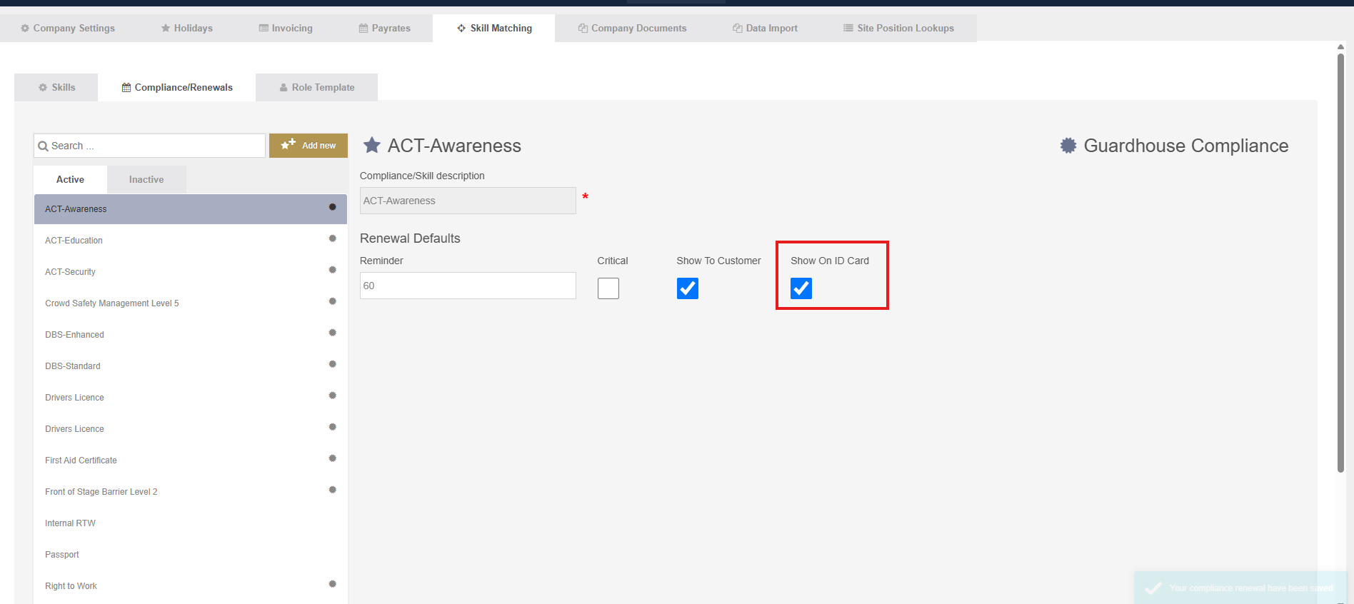 You can customise compliance items that are shown on the ID Card by going to Organisation - Company - Skill Matching - Compliance/ Renewals.