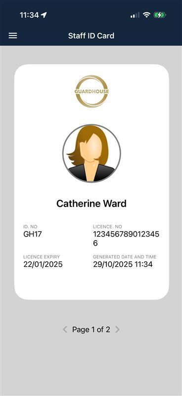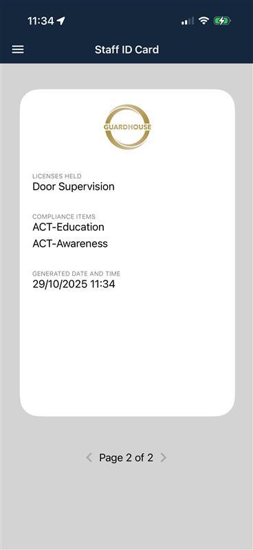 The ID card will then display with the first page showing your companies logo, the staff members profile picture, their name, ID number, license number and expiration date.