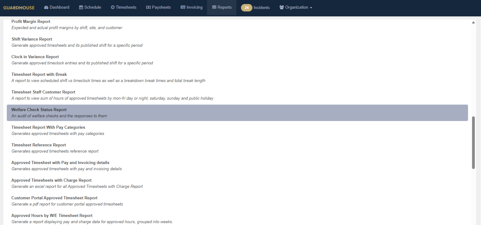 This report can be accessed and downloaded by going to Reports - Timesheet Reports - Welfare Check Status Report: