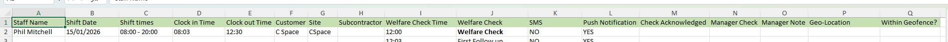 Column O shows whether the manager had left a note on, in the instances when they have acknowledged a check call on behalf of the guard: