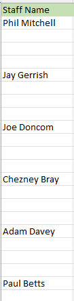 The Column A shows staff members names: