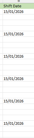 Column B shows the Shift Date: