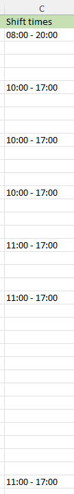 Column C shows the Shift Times: