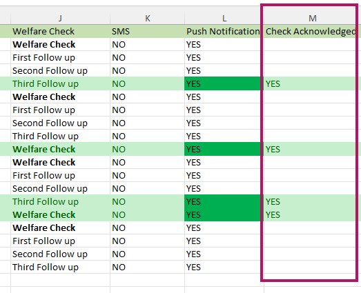 Column K shows whether an SMS was sent (only applicable for accounts that have SMS enabled and turn on for the welfare check setup):